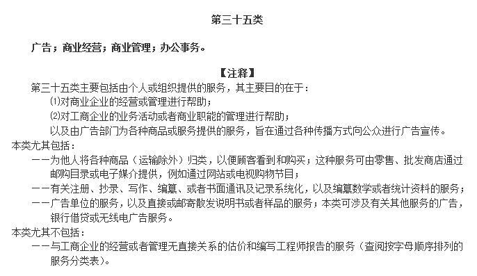 首先,我們先看看《類似商品和服務區分表――基于尼斯分類》對于35類的注釋: