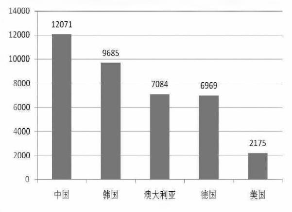 圖3:2014年商標(biāo)注冊量前5位的國家(地區(qū))?單位:件;