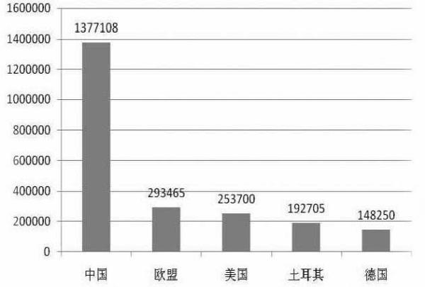 圖1:2014年全球商標(biāo)申請量前5位的國家(地區(qū))?單位:萬件;